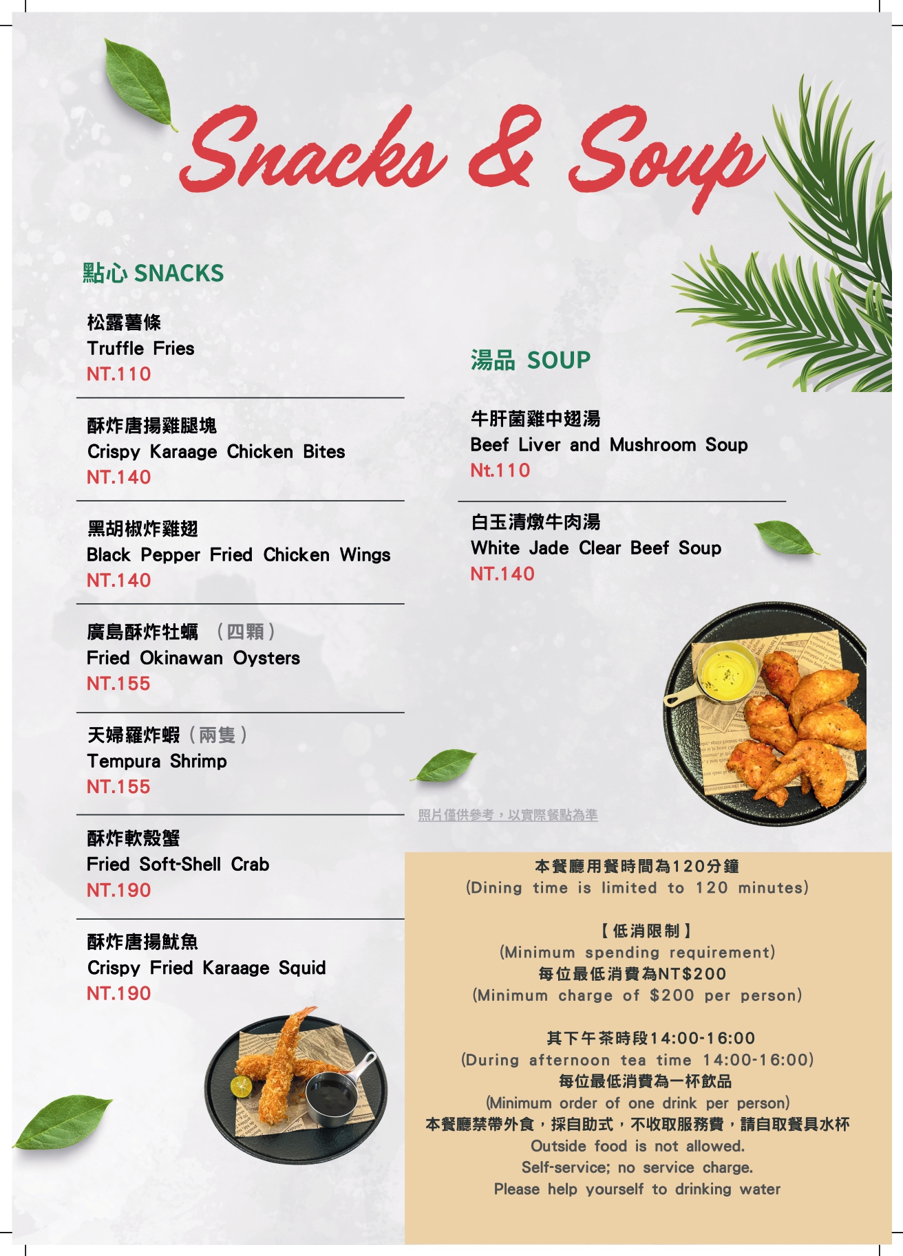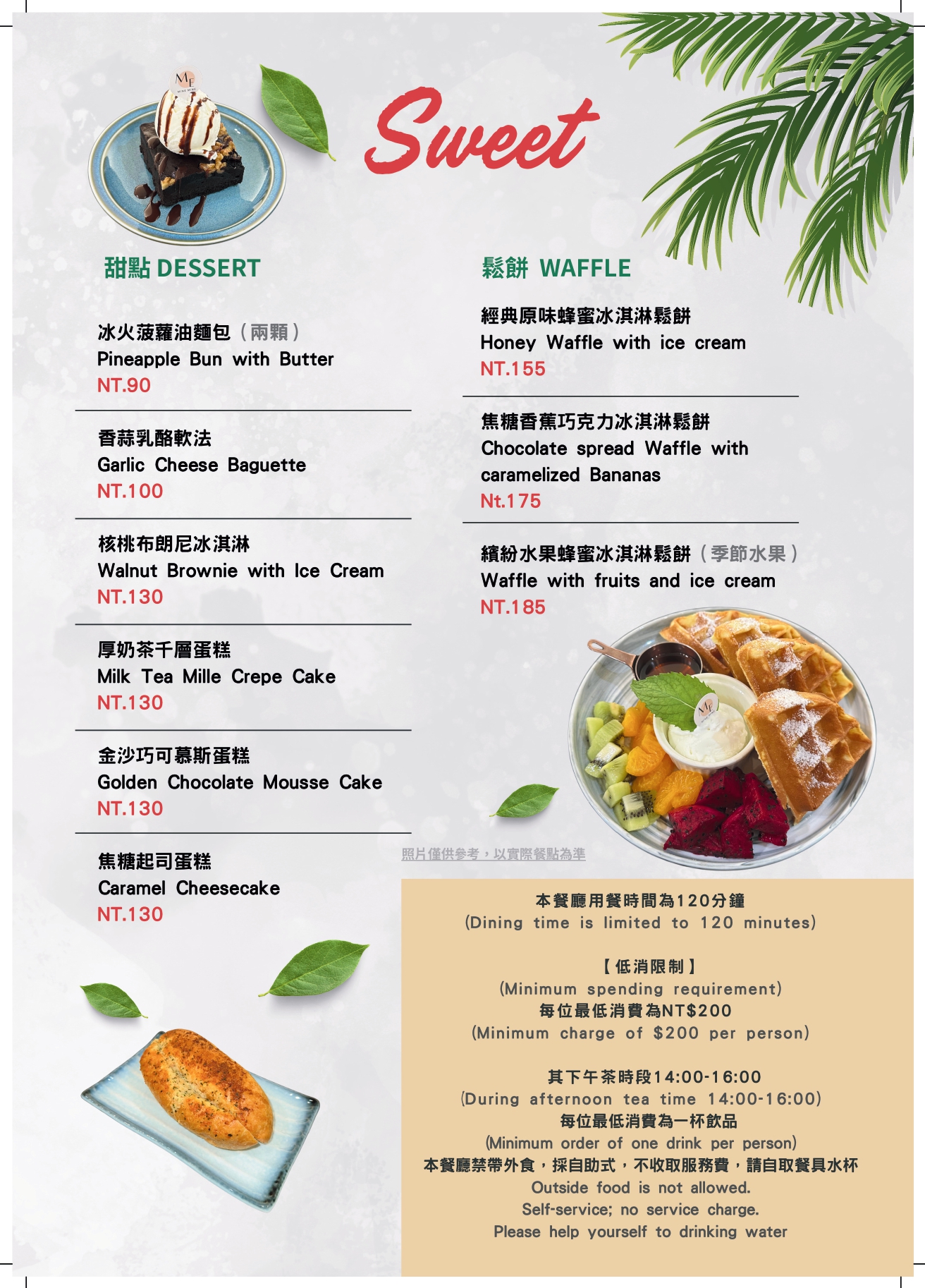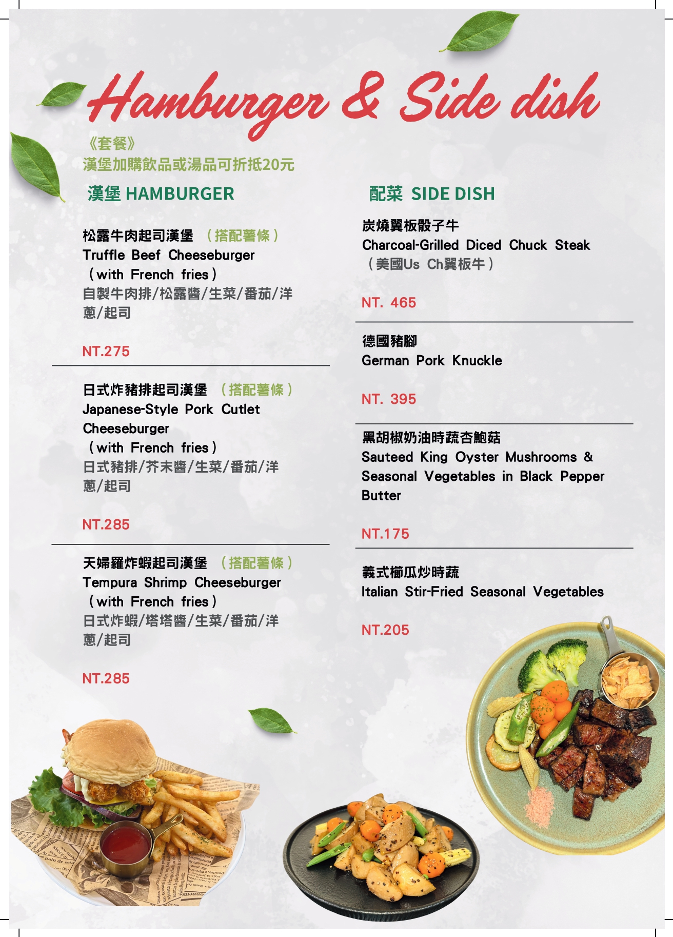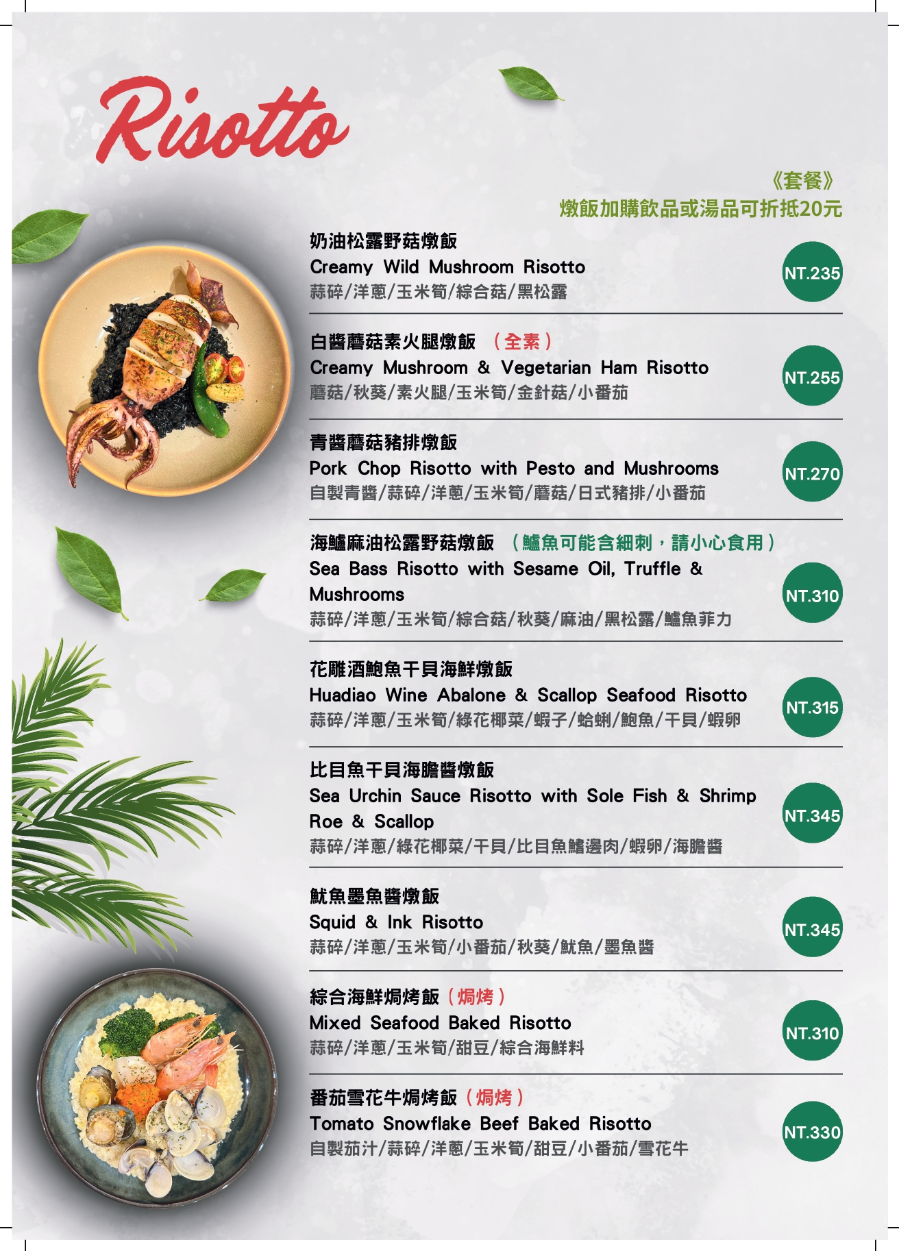 1. 餐點種類:義大利麵、燉飯、漢堡、早午餐、炸物、咖啡、飲料、蛋糕、鬆餅。